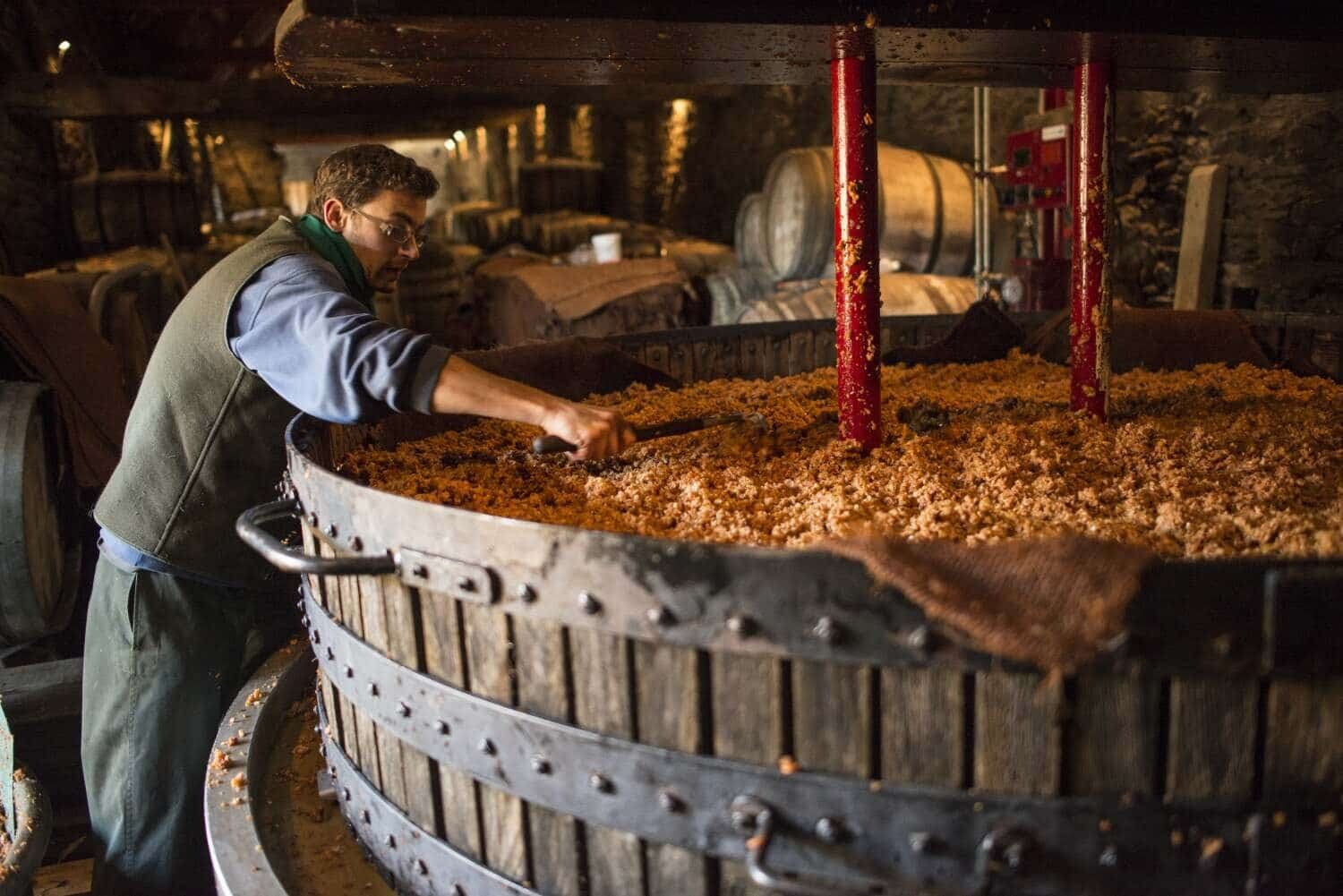その後、シャンパンプレスで24時間かけてゆっくり圧搾し、一般的には鋼鉄製のタンクが使われる中、オーク樽で6~8ヶ月間発酵させています。