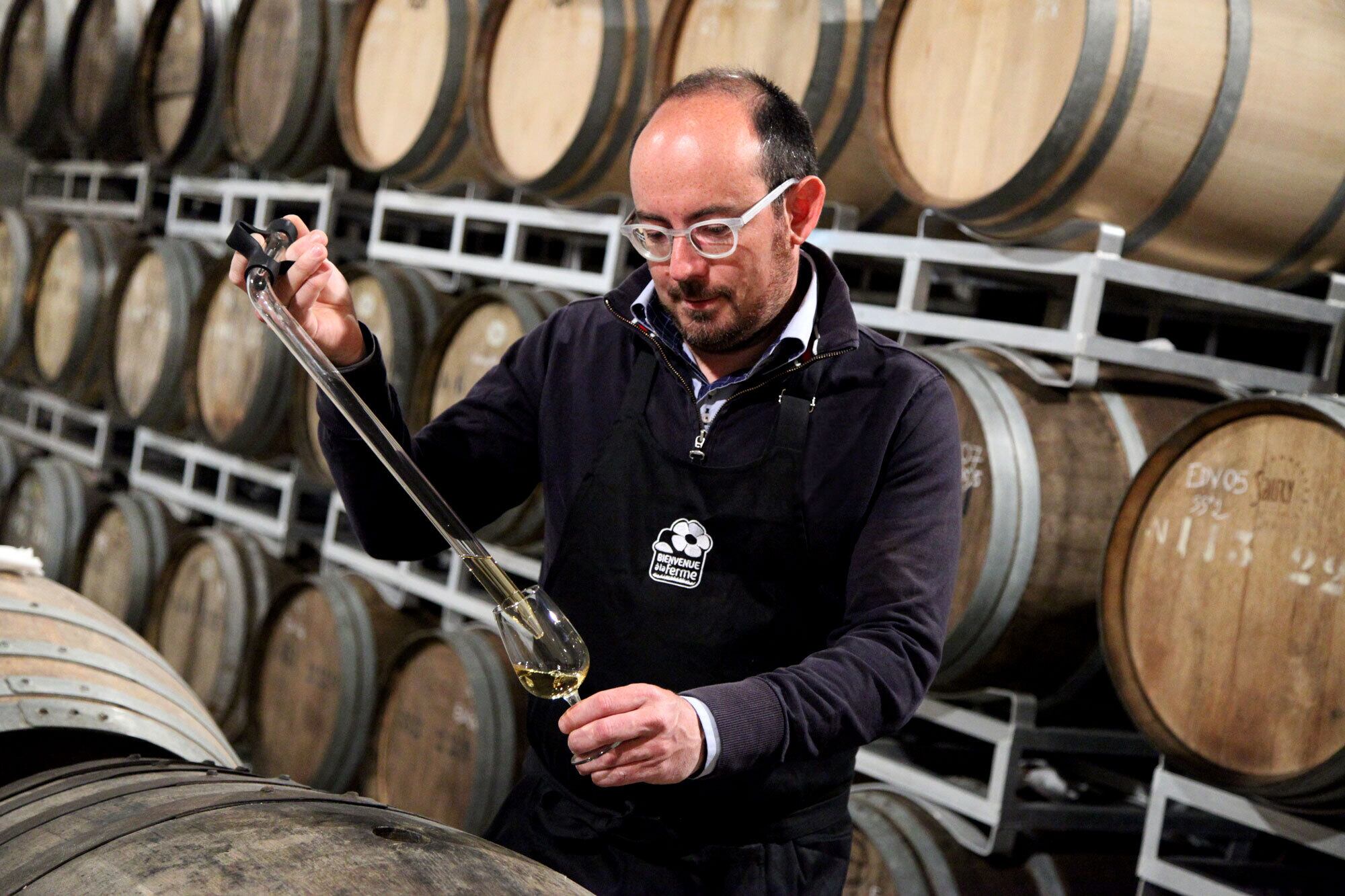 栽培期間中農薬不使用のシードル専用りんごが一つ一つ手で収穫され、20日から2.5ヶ月間、乾燥した場所で熟成させ、糖分を凝縮させます(パセリヤージュ技法)。その後、シャンパンプレスで24時間かけてゆっくり圧搾し、一般的には鋼鉄製のタンクが使われる中、オーク樽で6~8ヶ月間発酵させています。