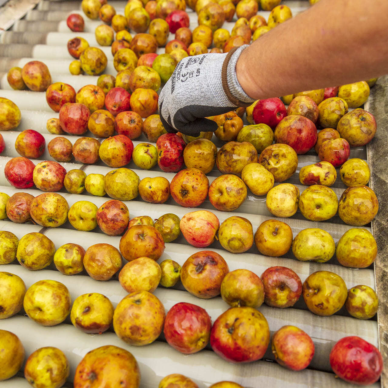 今日では400名の契約農家が厳選されたシードル用りんごの栽培に従事し、年間平均25,000トンのりんごを供給している。